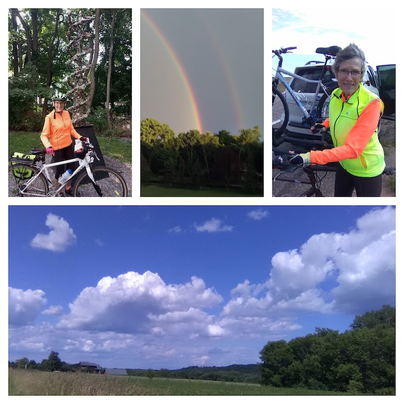 Clockwise from top left: Happy biker on any trip. Bonus—almost double rainbow, SAG car and driver rescued me from wind. Lots of sky views with hours on bike.